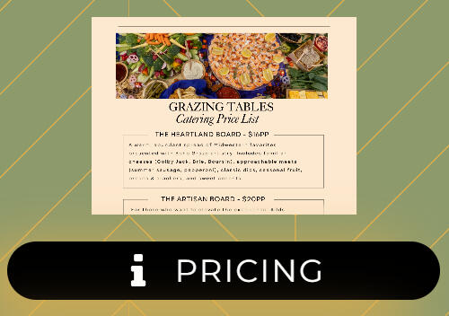 XL - 12x22" platter - serves 12-14 ... $125Plus, add on our Dessert Board (14" platter - serves 5-6) to elevate your gathering.Pick up only at 200 N Main St, Fairfield, IA on October 31st, 2025, 9am-5pm.Order Deadline October 25, 2025.Fill out the form and you will be sent an invoice to pay. Orders and payments must be placed by 10/25/25 for pickup on 10/31/25.